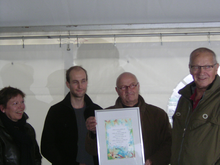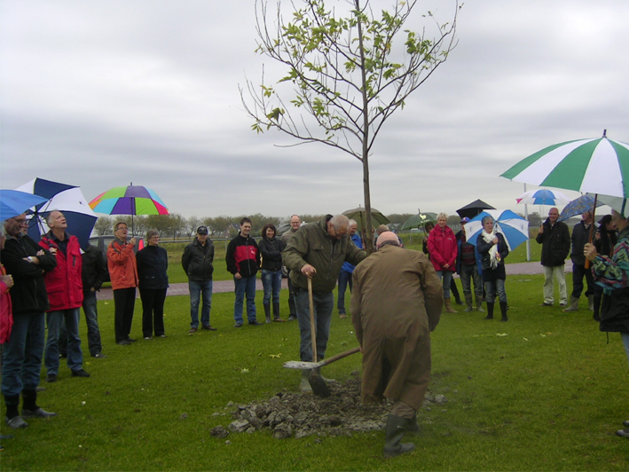 Koffie met een gebakje, toespraak van wethouder Cappon, planten van een notenboom en onthulling van het naambord.